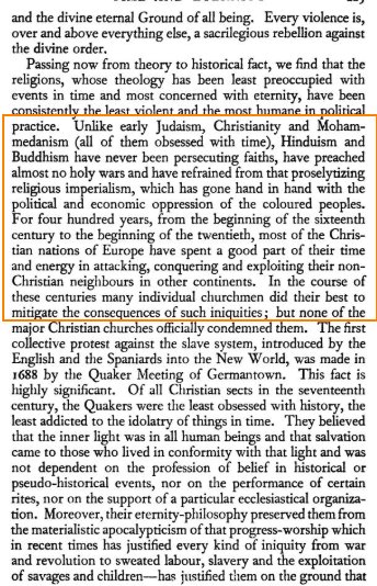 "Passing now from theory to historical fact, we find that the religions, whose theology has been least preoccupied with events in time and most concerned with eternity, have been consistently the least violent and the most humane in political practice. Unlike early Judaism, Christianity and Mohammedanism (all of them obsessed with time), Hinduism and Buddhism have never been persecuting faiths, have preached almost no holy wars and have refrained from that proselytizing religious imperialism, which has gone hand in hand with the political and economic oppression of the coloured peoples. For four hundred years, from the beginning of the sixteenth century to the beginning of the twentieth, most of the Christian nations of Europe have spent a good part of their time and energy in attacking, conquering and exploiting their non Christian neighbors in other continents. In the course of these centuries many individual churchmen did their best to mitigate the consequences of such iniquities ; but none of the major Christian churches officially condemned them. The first collective protest against the slave system, introduced by the English and the Spaniards into the New World, was made in 1688 by the Quaker Meeting of Germantown. This fact is highly significant. Of all Christian sects in the seventeenth century, the Quakers were the least obsessed with history, the least addicted to the idolatry of things in time. They believed that the inner light was in all human beings and that salvation came to those who lived in conformity with that light and was not dependent on the profession of belief in historical or pseudo-historical events, nor on the performance of certain rites, nor on the support of a particular ecclesiastical organization. Moreover, their eternity-philosophy preserved them from the materialistic apocalypticism of that progress-worship which in recent times has justified every kind of iniquity from war and revolution to sweated labour, slavery and the exploitation of savages and children has justified them on the ground that the supreme good is in future time and that any temporal means, however intrinsically horrible, may be used to achieve that good. Because Quaker theology was a form of eternity philosophy, Quaker political theory rejected war and persecution as means to ideal ends, denounced slavery and proclaimed racial equality. Members of other denominations had done good work for the African victims of the white man's rapacity. One thinks, for example, of St. Peter Claver at Cartagena. But this heroically charitable 'slave of the slaves' never raised his voice against the institution of slavery or the criminal trade by which it was sustained; nor, so far as the extant documents reveal, did he ever, like John Woolman, attempt to persuade the slave-owners to free their human chattels. The reason, presumably, was that Claver was a Jesuit, vowed to perfect obedience and constrained by his theology to regard a certain political and ecclesiastical organization as being the mystical body of Christ."