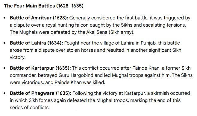 Key Incidents: Four major battles were fought between Mughal forces of Emperor Shah Jahan and 6th Sikh Guru Hargobind 1595–1644, (Amritsar, Lahira, Kartarpur, and Phagwara).