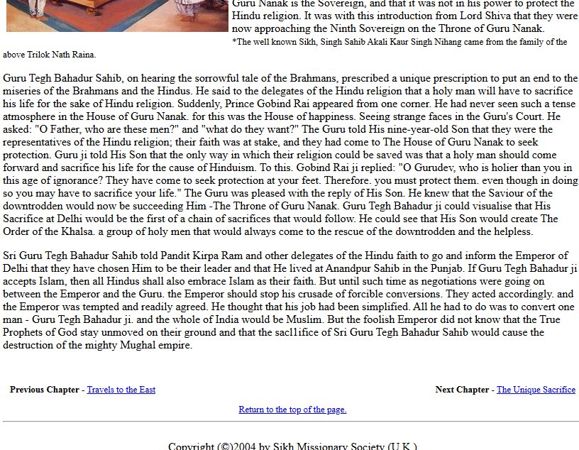 "Sri Guru Tegh Bahadur Sahib told Pandit Kirpa Ram and other delegates of the Hindu faith to go and inform the Emperor of Delhi that they have chosen Him to be their leader and that He lived at Anandpur Sahib in the Punjab. If Guru Tegh Bahadur ji accepts Islam, then all Hindus shall also embrace Islam as their faith. But until such time as negotiations were going on between the Emperor and the Guru. the Emperor should stop his crusade of forcible conversions. They acted accordingly. and the Emperor was tempted and readily agreed. He thought that his job had been simplified. All he had to do was to convert one man - Guru Tegh Bahadur ji. and the whole of India would be Muslim.